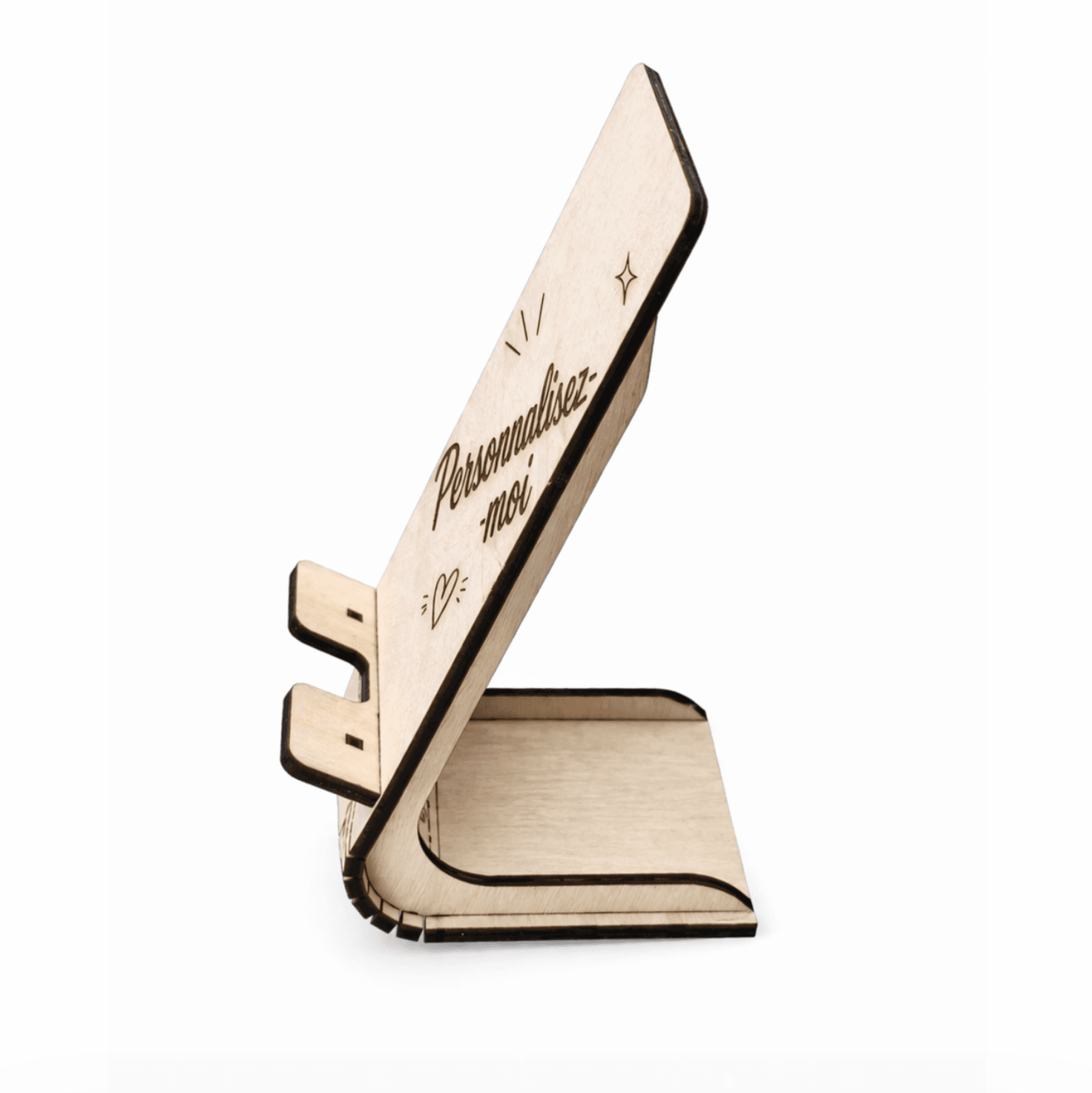 Support téléphone en bois personnalisable – Modèle profil incliné gravé au laser