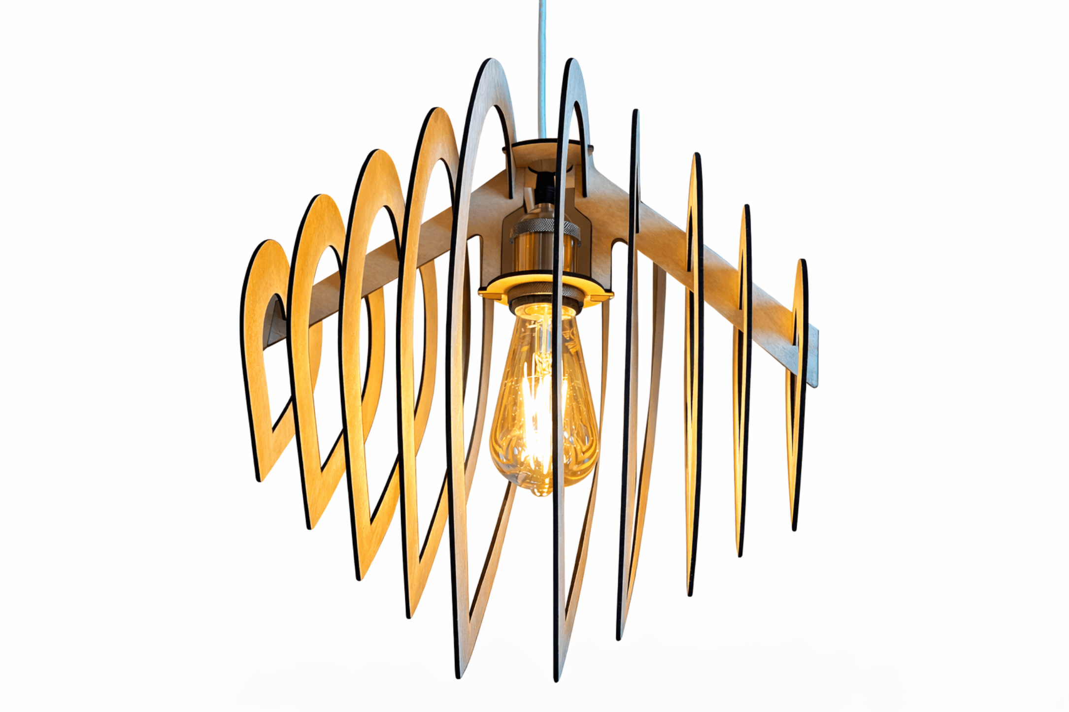 Composée de plusieurs couches de bois découpées avec précision, cette suspension crée un magnifique jeu de profondeur et de lumière. En son centre, l’ampoule visible diffuse une lumière chaude et enveloppante qui sublime les courbes du bois et crée une ambiance cosy instantanée.